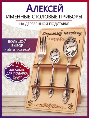 Именной столовый набор приборов Алексей из 3-х предметов на подставке
