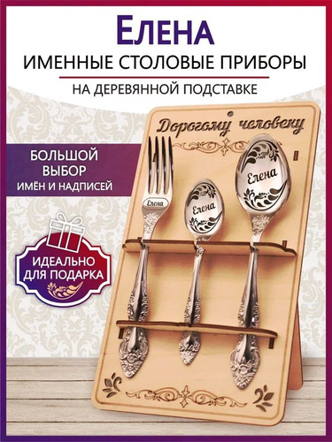 Именной столовый набор приборов Елена из 3-х предметов на подставке