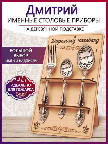 Именной столовый набор приборов Дмитрий из 3-х предметов на подставке