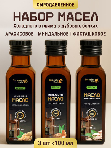 Набор масел арахисовое, миндальное, масло грецкого ореха нерафинированное, сыродавленное, холодного отжима пищевое. Объем - 100 мл