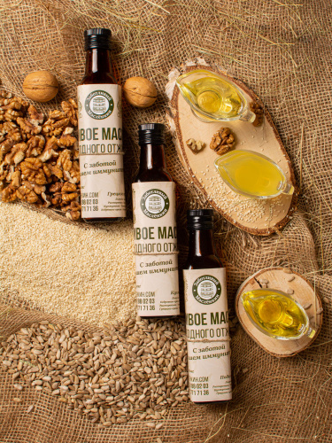 Набор масел арахисовое, кунжутное, масло грецкого ореха нерафинированное, сыродавленное, холодного отжима пищевое. Объем - 100 мл
