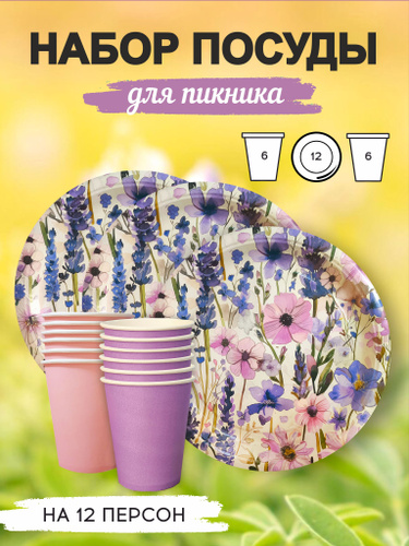 Набор одноразовой бумажной посуды с цветами на 12 персон