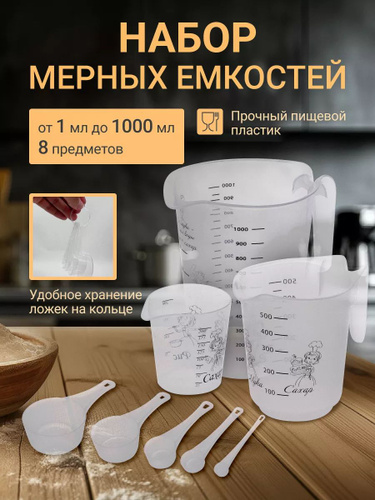 Мерный стакан, графин и ложки, кухонный набор принадлежностей, посуда для кухни, емкости SparkPlast, набор 8 шт., 1000 мл 500 мл 200 мл 100 мл 50 мл 15 мл 5 мл 1 мл.