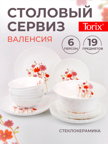 Набор посуды на 6 персон, 19 предметов, сервиз столовый из стеклокерамики TORIX "Валенсия" NH19OT/12148