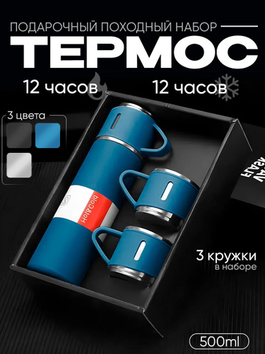 Термос для чая, вакуумный, с кружками, набор посуды подарочный, синий