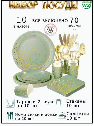 (70 шт)Одноразовая посуда для праздника набор на 10 персон набор посуды одноразовой