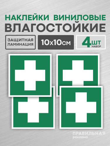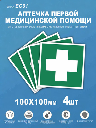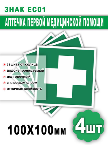 Знак ЕС01 "Аптечка первой медицинской помощи" 10х10 см. - 4 шт. наклейка влагостойкая. Правильная реклама