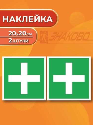 Знак безопасности наклейка зеленый крест "Аптечка" 20 х 20 см., 2 штуки