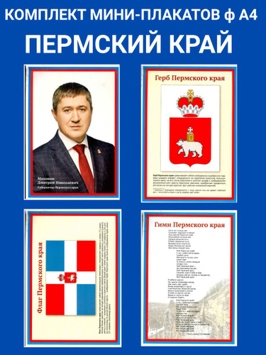 Комплект мини-плакатов Пермский край. Гимн, Герб, Флаг, Портрет губернатора ф.А4