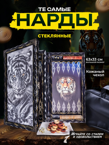 Нарды стеклянные с рисунком Тигр, нарды большие деревянные 60х60 см, подарочные резные в кожаном чехле