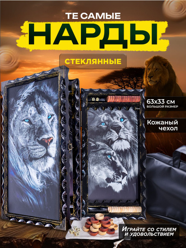 Нарды стеклянные с рисунком Лев и львица, нарды большие деревянные 60 на 60 см, подарочные резные в кожаном чехле