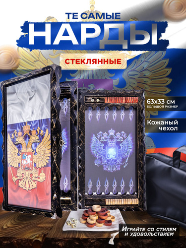 Нарды стеклянные с рисунком Герб РФ, нарды большие деревянные 60х60 см, подарочные резные в кожаном чехле