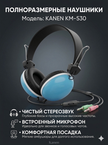 Наушники проводные с микрофоном km-530, 3.5 мм x2, синий