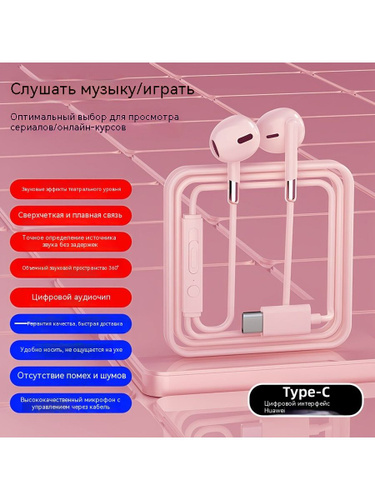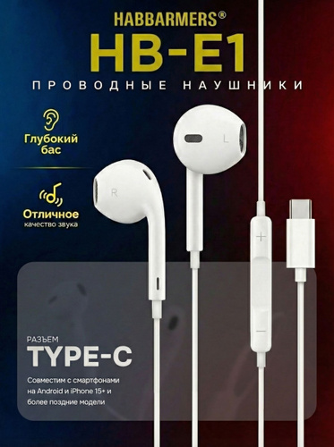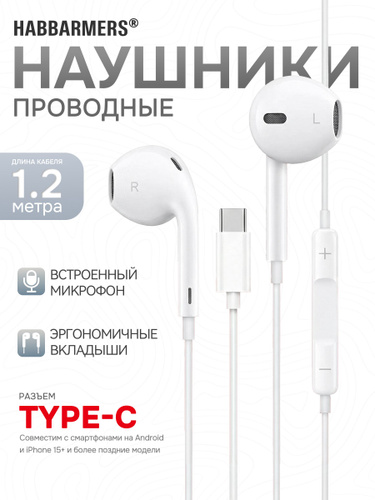 HABBARMERS Наушники проводные Type C для телефона с микрофоном для iPhone 15-16 и Android, белый