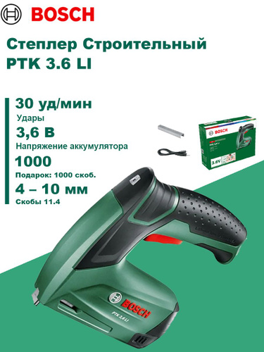 BOSCH, степлер строительный, PTK 3.6 LI, 3.6B, 4-10мм, 1.5 Ач, 30 уд/мин.