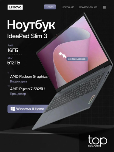 Lenovo IdeaPad Slim 3 15ABR8 82XM00LMUS Ноутбук 15.6", AMD Ryzen 7 5825U, RAM 16 ГБ, SSD 512 ГБ, AMD Radeon Graphics, Windows Home, (82XM00LMUS), серебристый, Русская раскладка