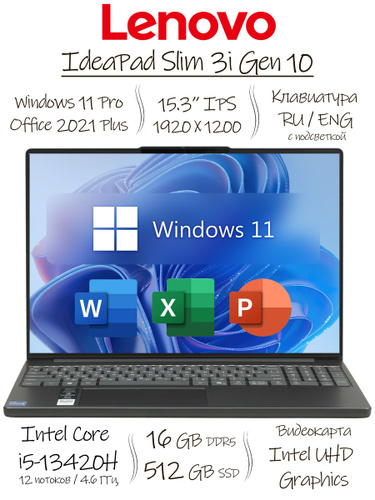 Lenovo IdeaPad Slim 3i Gen 10, Office 2021 Pro Plus, Металлическая крышка, Подсветка клавиатуры, Ноутбук 15.3", Intel Core i5-13420H, RAM 16 ГБ, SSD 512 ГБ, Intel UHD Graphics, Windows Pro, серый металлик, Русская раскладка