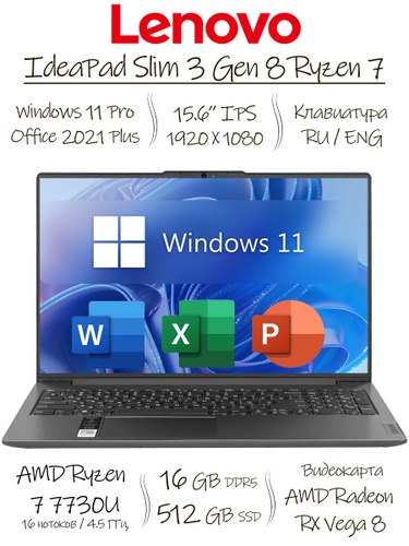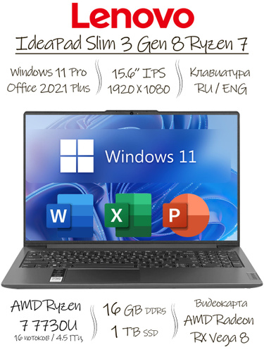 Lenovo IdeaPad Slim 3 G8, Office 2021 Pro Plus + Adobe Acrobat Pro, Ноутбук 15.6", AMD Ryzen 7 7730U, RAM 16 ГБ, SSD 512 ГБ, AMD Radeon RX Vega 8, Windows Pro, серый металлик, Русская раскладка