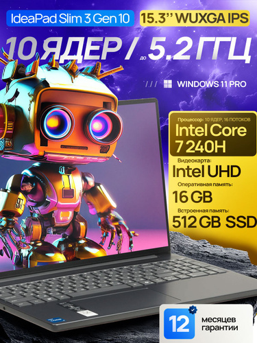 Lenovo IdeaPad Slim 3i Gen 10 (2025) Ноутбук 15.3", Intel Core 7 240H, RAM 16 ГБ, SSD 512 ГБ, Intel UHD Graphics, Windows Pro, серый металлик, Русская раскладка