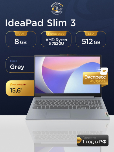 Lenovo IdeaPad Slim 3 15AMN8 Ноутбук 15.60", AMD Ryzen 5 7520U, RAM 8 ГБ, SSD 512 ГБ, AMD Radeon Graphics, Без системы, (82XQ00JQRK), серый, Русская раскладка. Уцененный товар