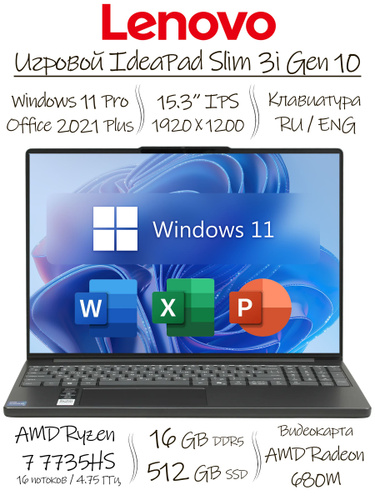 Lenovo IdeaPad Slim 3 Gen 10, Office 2021 Pro Plus + Adobe Photoshop 2024 + Adobe Acrobat Pro Ноутбук 15.3", AMD Ryzen 7 7735HS, RAM 16 ГБ, SSD 512 ГБ, AMD Radeon 680M, Windows Pro, светло-серый, Русская раскладка