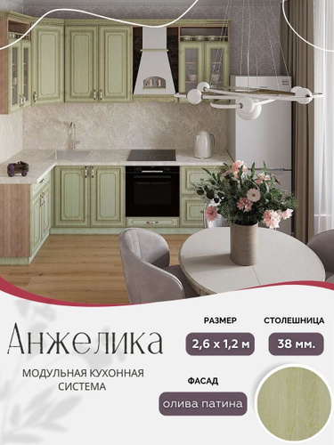Угловой классический кухонный гарнитур Анжелика МДФ, 2,6х1,2 м Олива патина