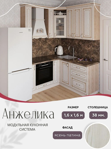 Угловой классический кухонный гарнитур Анжелика МДФ, 1,6х1,6 м Ясень патина