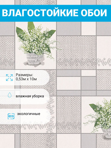 Обои бумажные брянские влагостойкие Ландыши 3 бело-серые, моющиеся, без подгона 0,53м х 10м
