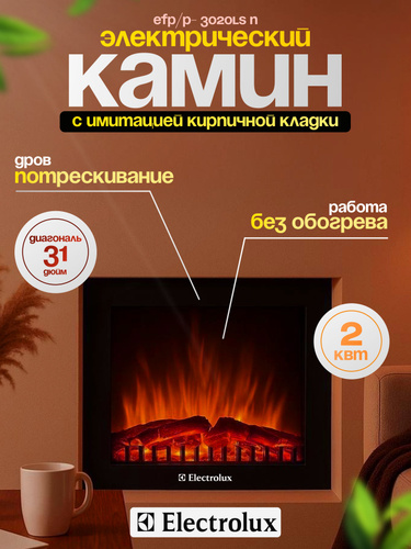 Электрический очаг Electrolux EFP P 3020LS N, камин с эффектом живого огня, диагональ экрана 31 дюйм, имитация кирпичной кладки, Real Fire Perfect, Real Sound, очаг с обогревом