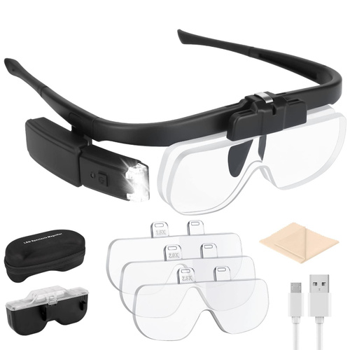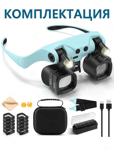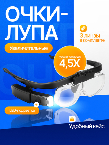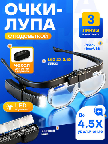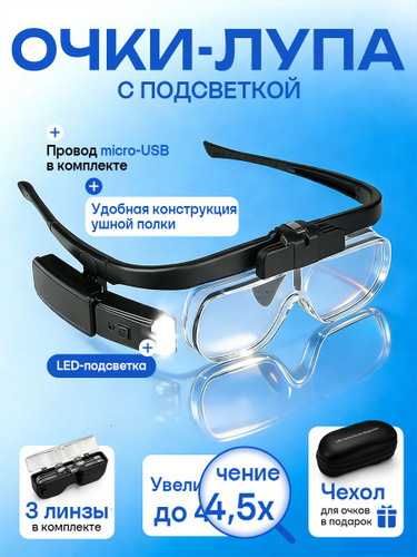 Очки лупа увеличительные с подсветкой, со сменными линзами в футляре, лупа налобная