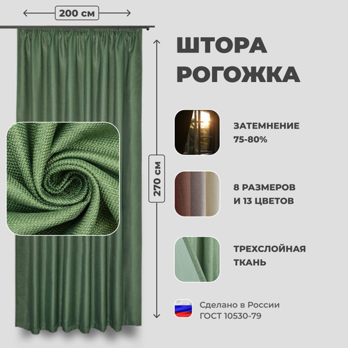 Штора для комнаты 200x270 см Блэкаут рогожка Shtoraland на ленте для крючков, одна портьера для гостиной, спальни, детской. Зеленый цвет