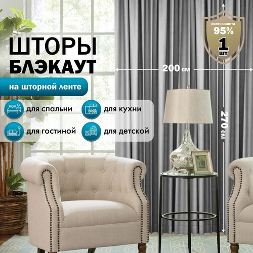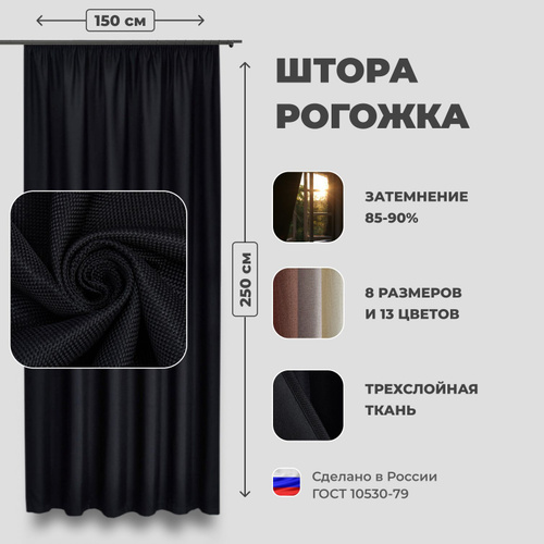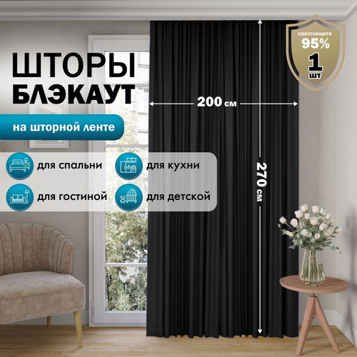 Штора для комнаты 200x270 см Блэкаут рогожка Shtoraland на ленте для крючков, одна портьера для гостиной, спальни, детской. Черный цвет