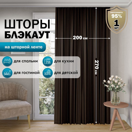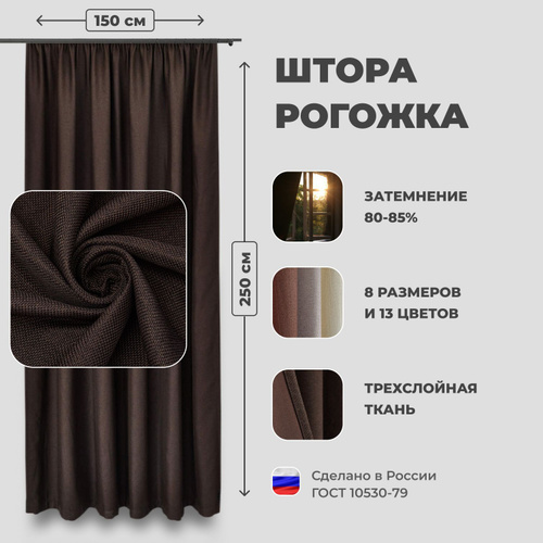 Штора для комнаты 150x250 см Блэкаут рогожка Shtoraland на ленте для крючков, одна портьера для гостиной, спальни, детской. Темно-коричневый цвет (венге)
