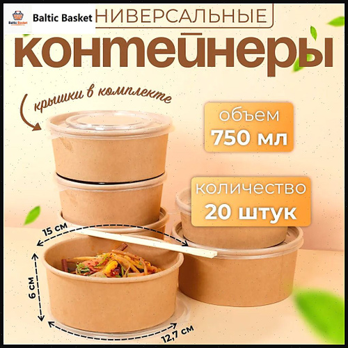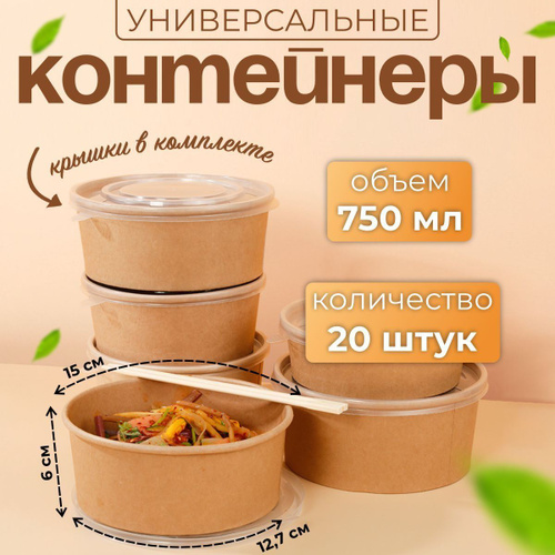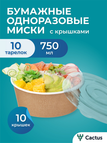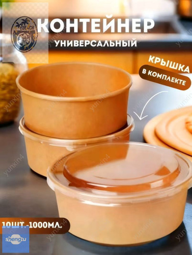 Контейнеры одноразовые круглые с крышкой крафт ; (750мл) 10 штук ; упакованная бумажная миска для пикника