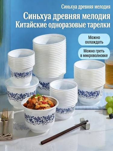 Одноразовые пластиковые миски в стиле сине-белой керамики, 50 штук, пищевой PP пластик, для пикников и праздников