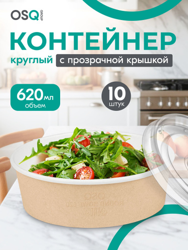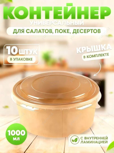 Пищевой одноразовый контейнер для салата круглый, бумажный крафт, упаковка 10 штук, с крышкой