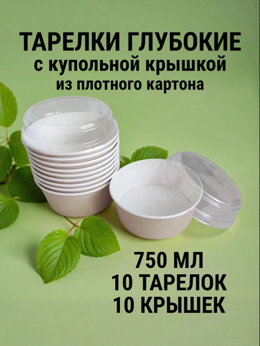 Тарелки одноразовые бумажные глубокие для супа с прозрачной купольной пластиковой крышкой - 750 мл , набор посуды 10 штук + 10 крышек, контейнер с крышкой для салата