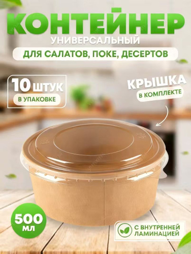 Контейнеры одноразовые круглые с крышкой крафт ; (500мл) 10 штук ; упакованная бумажная миска для пикника