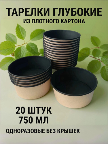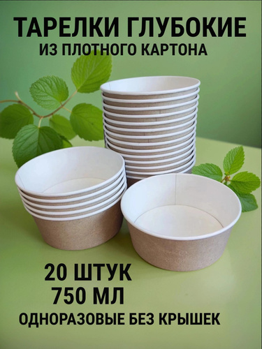 Тарелки одноразовые бумажные глубокие для супа - 750 мл, набор посуды 20 штук, крафт миски, контейнер для салата