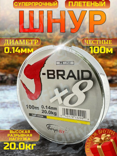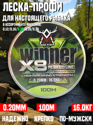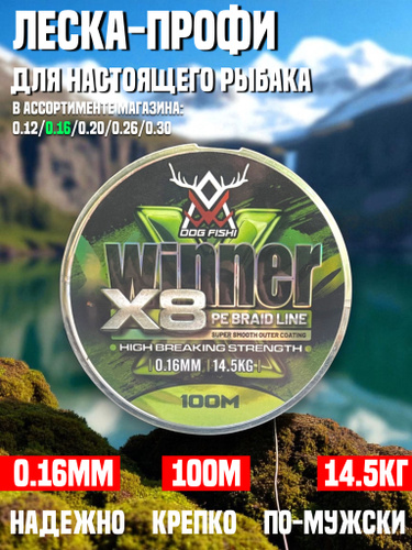 Леска - шнур для рыбалки, плетеный X8, зеленый, 0,20 мм, 16 кг, 100м