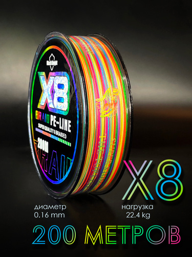 Плетеный шнур для рыбалки 8 жильный 200 м, 0.16 мм, разноцветный