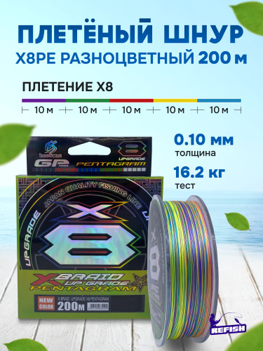Плетеный шнур для рыбалки 8 жильный 200 м, 0.10 мм, разноцветный