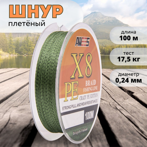 Плетеный шнур 8-жильный AWEES PE-X8 0,24 мм, тест 17,5 кг, 100 м, леска для рыбалки, плетенка для спиннинга, фидера