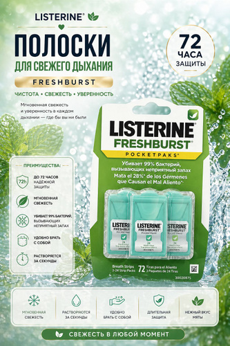 Полоски для свежего дыхания Listerine Freshburst PocketPaks, 72 шт (3 24), растворимые мятные пластины