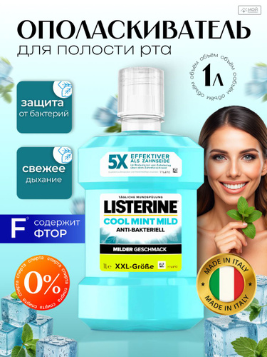 LISTERINE Ополаскиватель для полости рта Прохладная Мята / Cool Mint Mild 1 л., антибактериальный, со фтором, без спирта