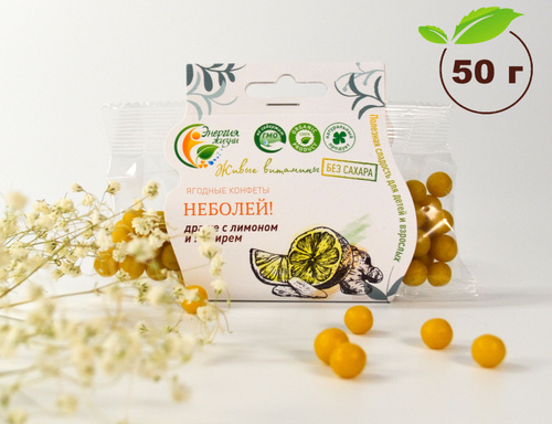Живые конфеты без сахара для иммунитета с лимоном и имбирем Энергия жизни Не болей для взрослых и детей, 50 г.