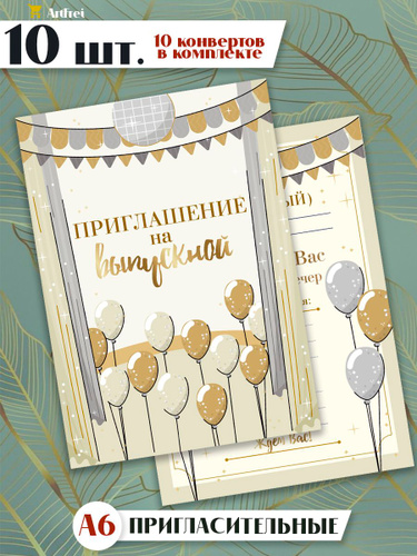 Пригласительные на выпускной с конвертами. 10 штук. Золотой