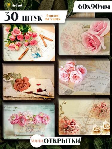 Мини открытки "Роза Ретро" / 30 штук / набор 6 видов по 5 шт