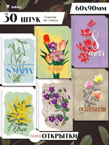 Набор мини открыток на 8 марта "Ретро" / 30 шт. / 6 видов по 5 штук