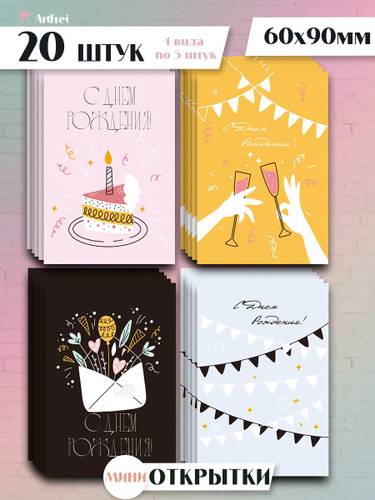Мини открытки "С днем рождения" / 20 штук / набор 4 вида по 5 шт